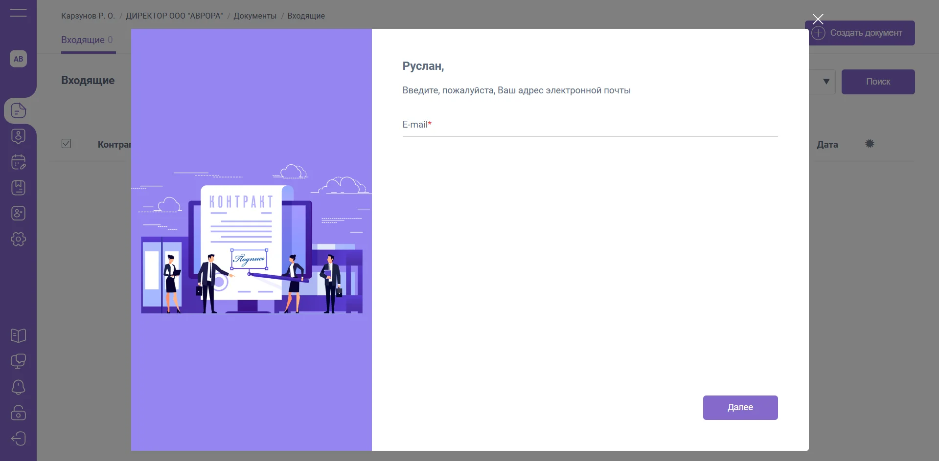 Далее потребуется заполнить email, который в дальнейшем будет использоваться как почта для отправки уведомлений о поступивших документах.