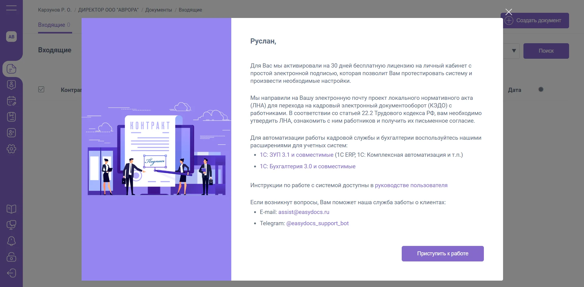 При завершении регистрации активируется бесплатная лицензия на личный кабинет с простой электронной подписью, которая позволит Вам протестировать систему и произвести необходимые настройки.