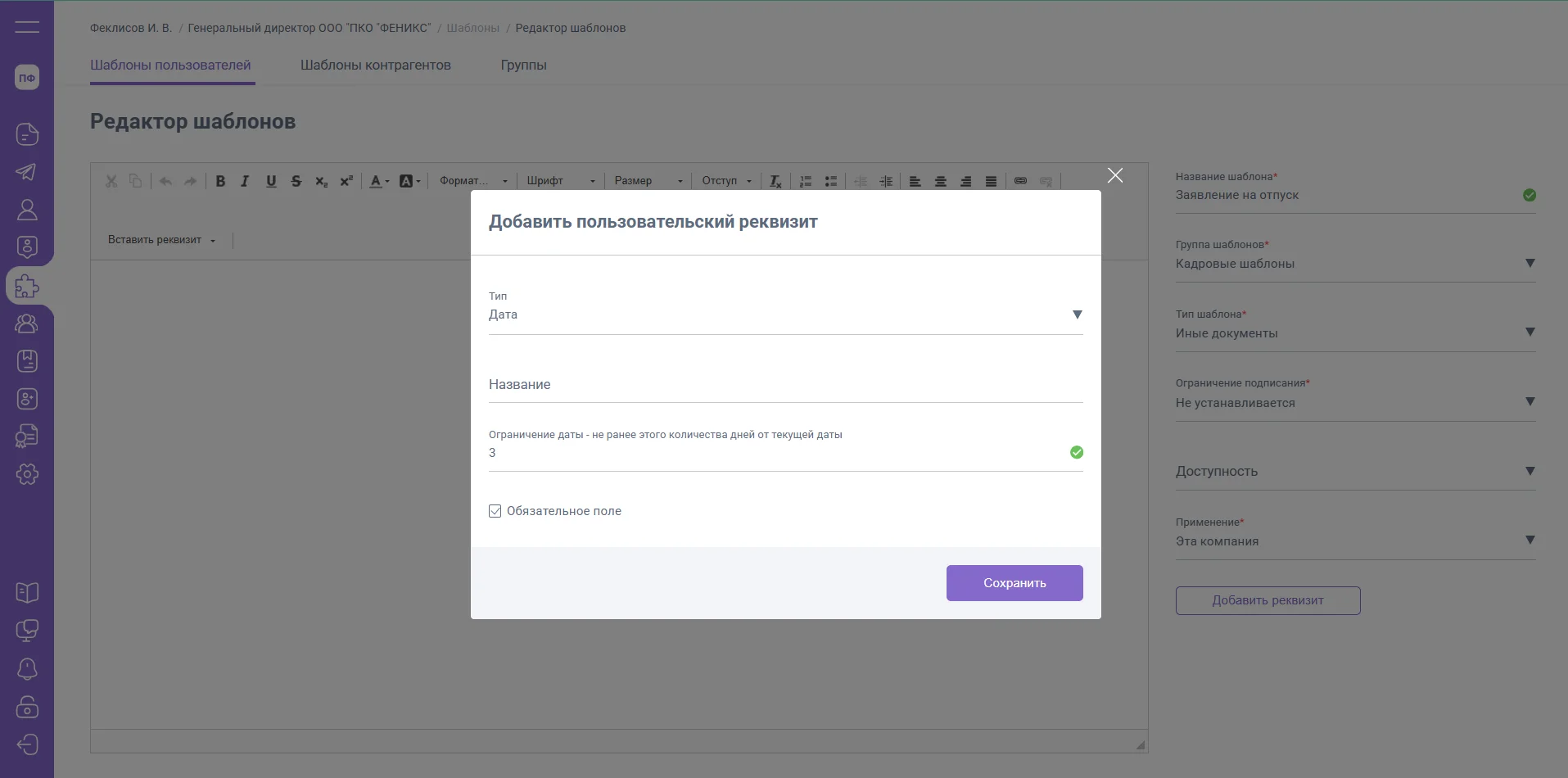 Если в шаблоне добавлен дополнительный реквизит «Дата», то дополнительно вы сможете установить ограничение по подписанию созданного пользователем документа.