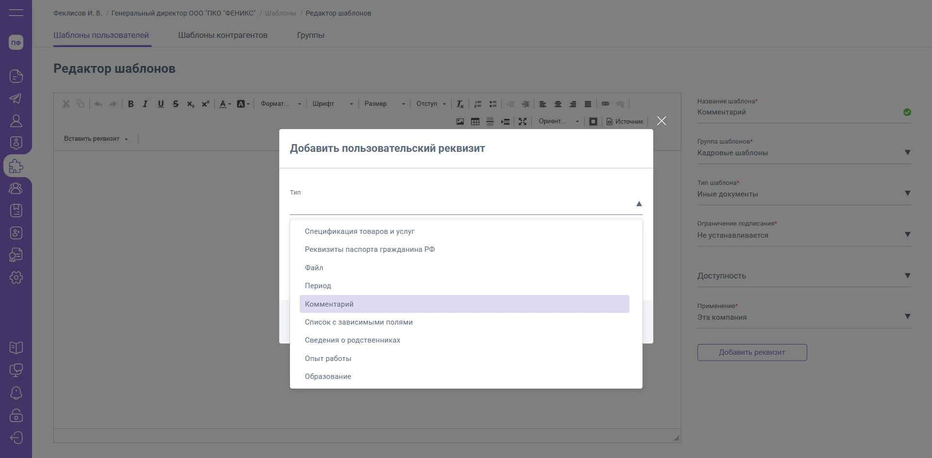 После выбора типа реквизита появится поле для ввода комментария. Для сохранения уже заполненного реквизита необходимо нажать кнопку «Сохранить».