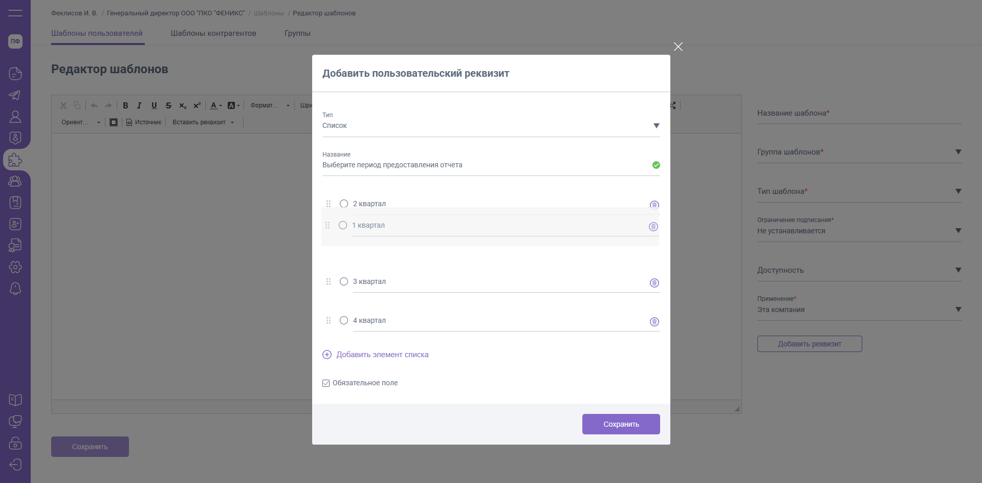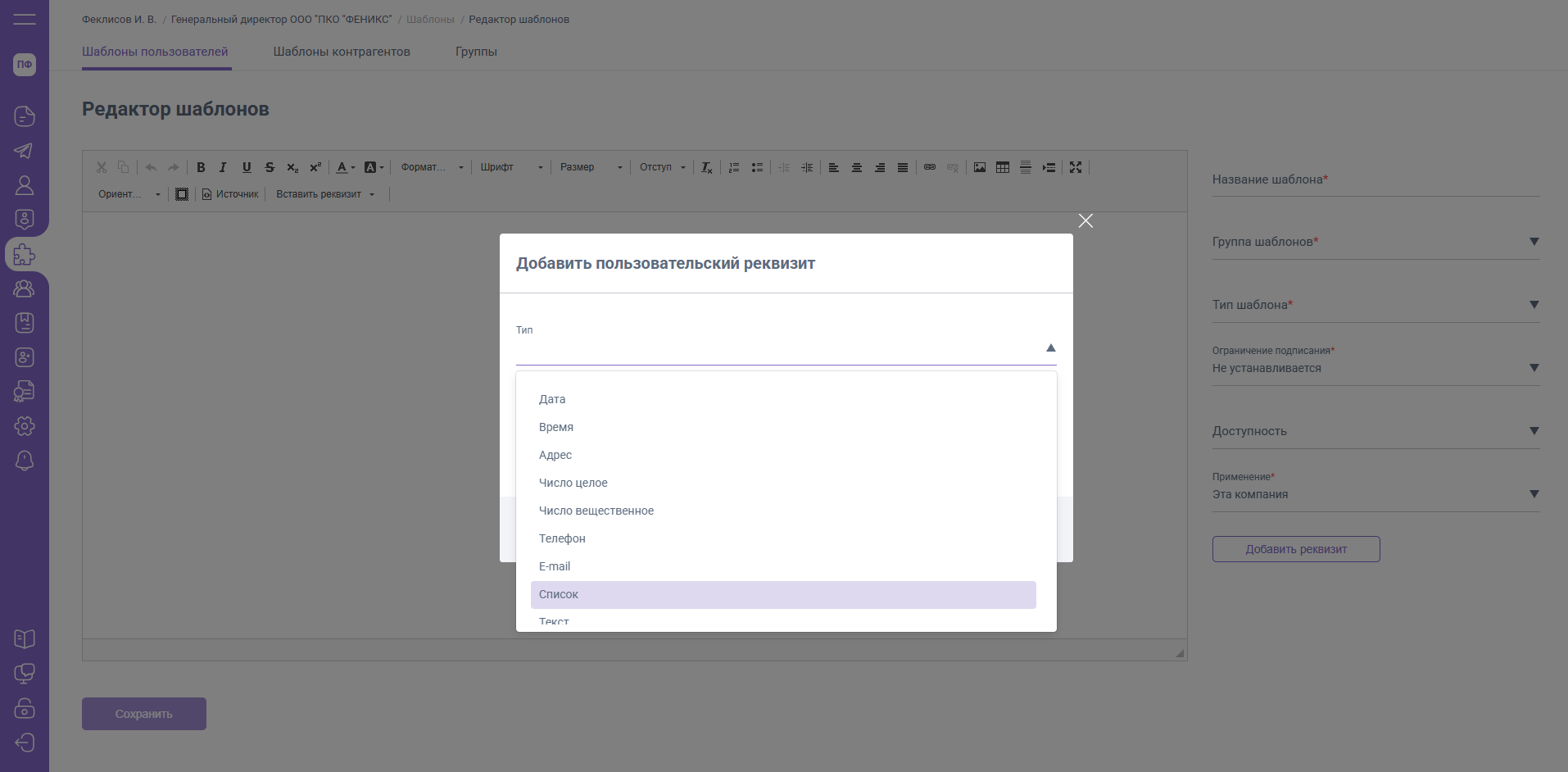 Дополнительный реквизит «Список» позволит добавить в шаблон поле с выпадающим списком, где будут отображены настроенные организацией варианты выбора. Для добавления списка в шаблон нажмите кнопку «Добавить реквизит» и выберите тип реквизита «Список».