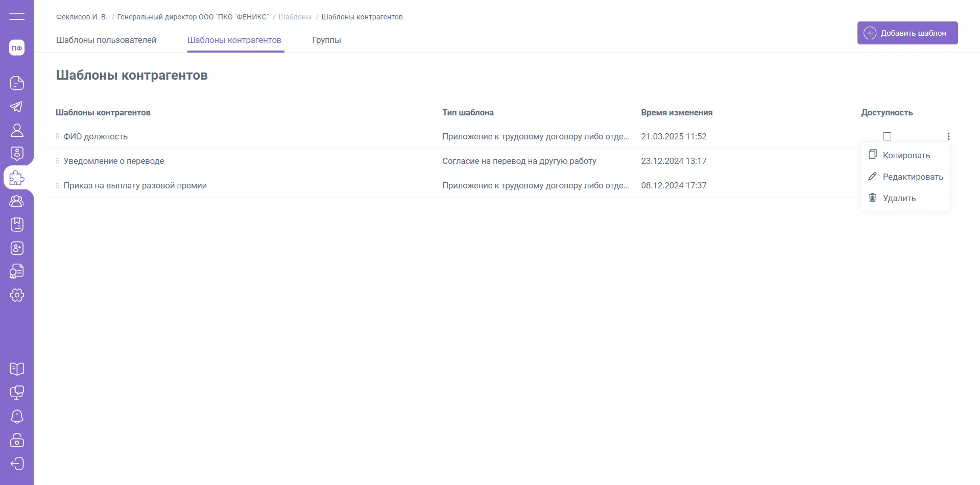 В меню «Действия» можно скопировать, отредактировать или удалить выбранный шаблон.