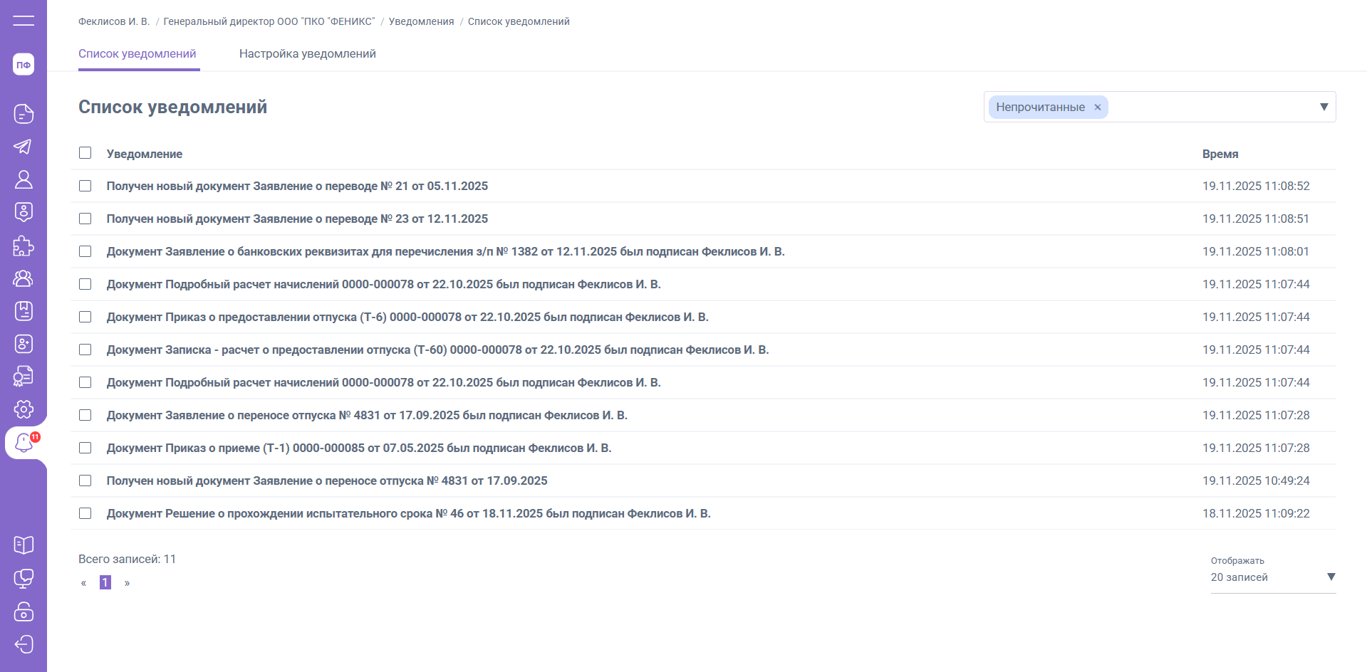 Для изменения статуса уведомления на «Прочитано» вы можете нажать на уведомления для перехода в документ, или изменить статус вручную при установке галочки слева от уведомления.