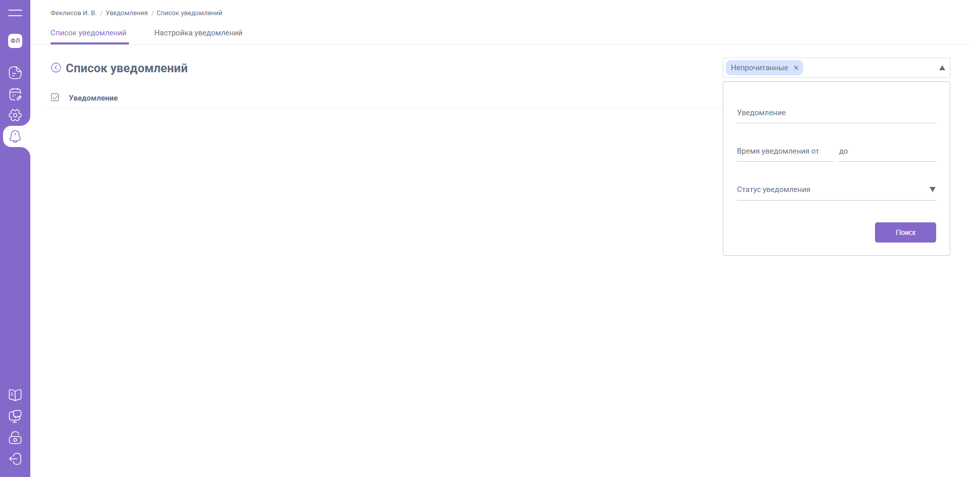 В правом верхнем углу вкладки «Список уведомлений» вы можете выполнить отбор уведомлений по параметрам: