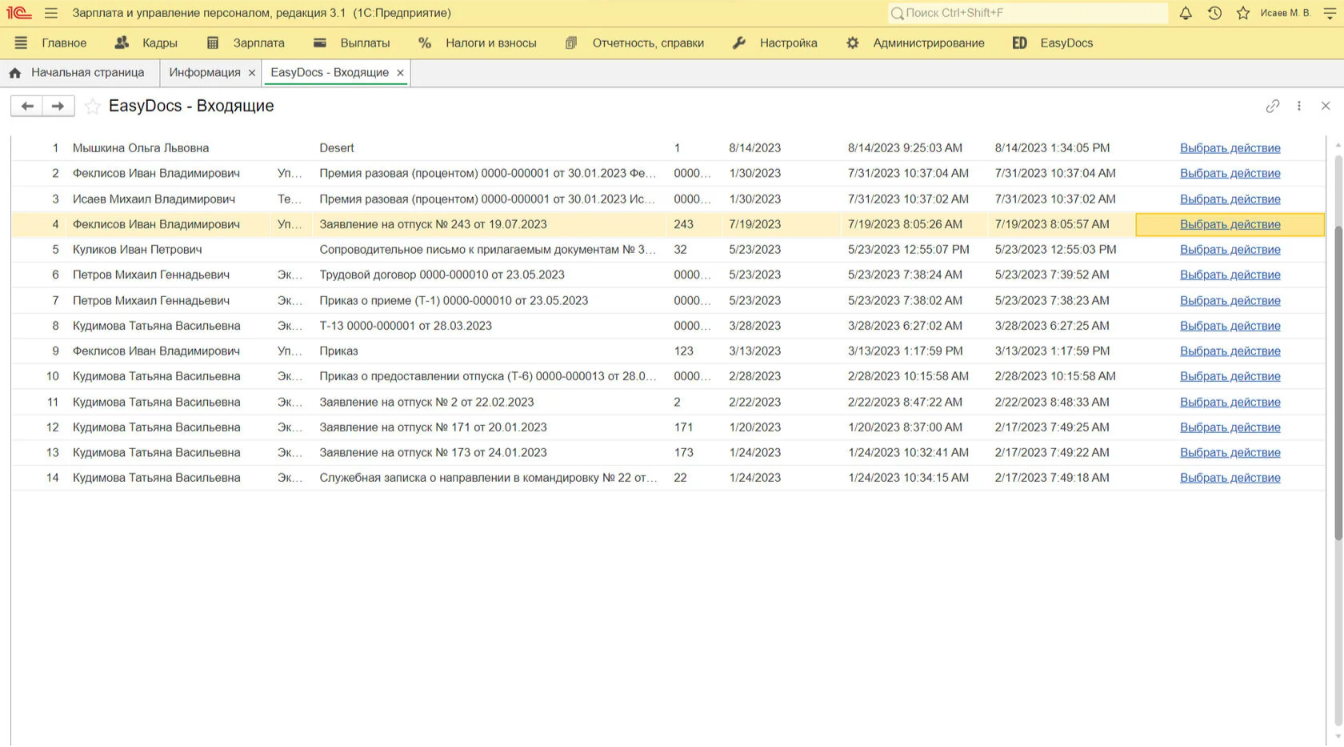 При обновлении папки «Входящие» отображаются текущие документы, которые требует определенных действий (подписание/согласование/отклонения) от работодателя.