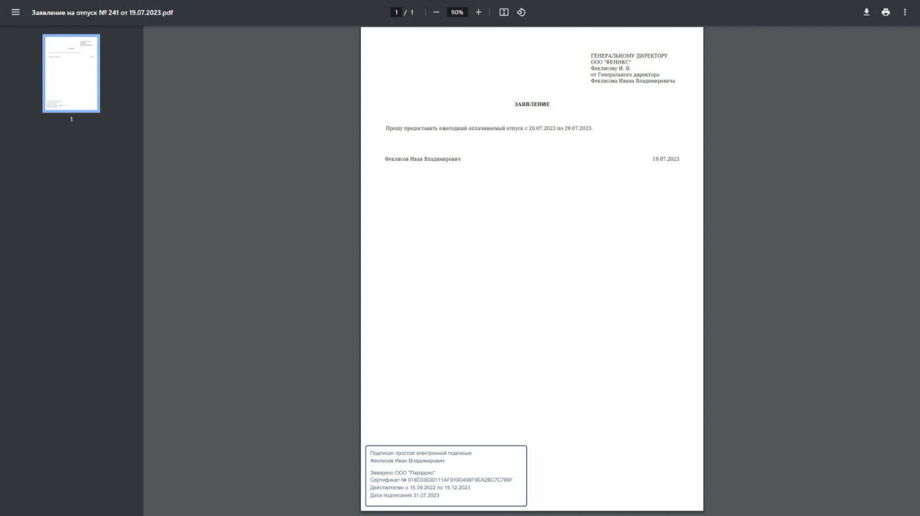 После получения заявления можно просмотреть документ, кликнув два раза на название документа или выбрав в меню действий "Посмотреть" , отобразится печатная форма в формате pdf для ознакомления.